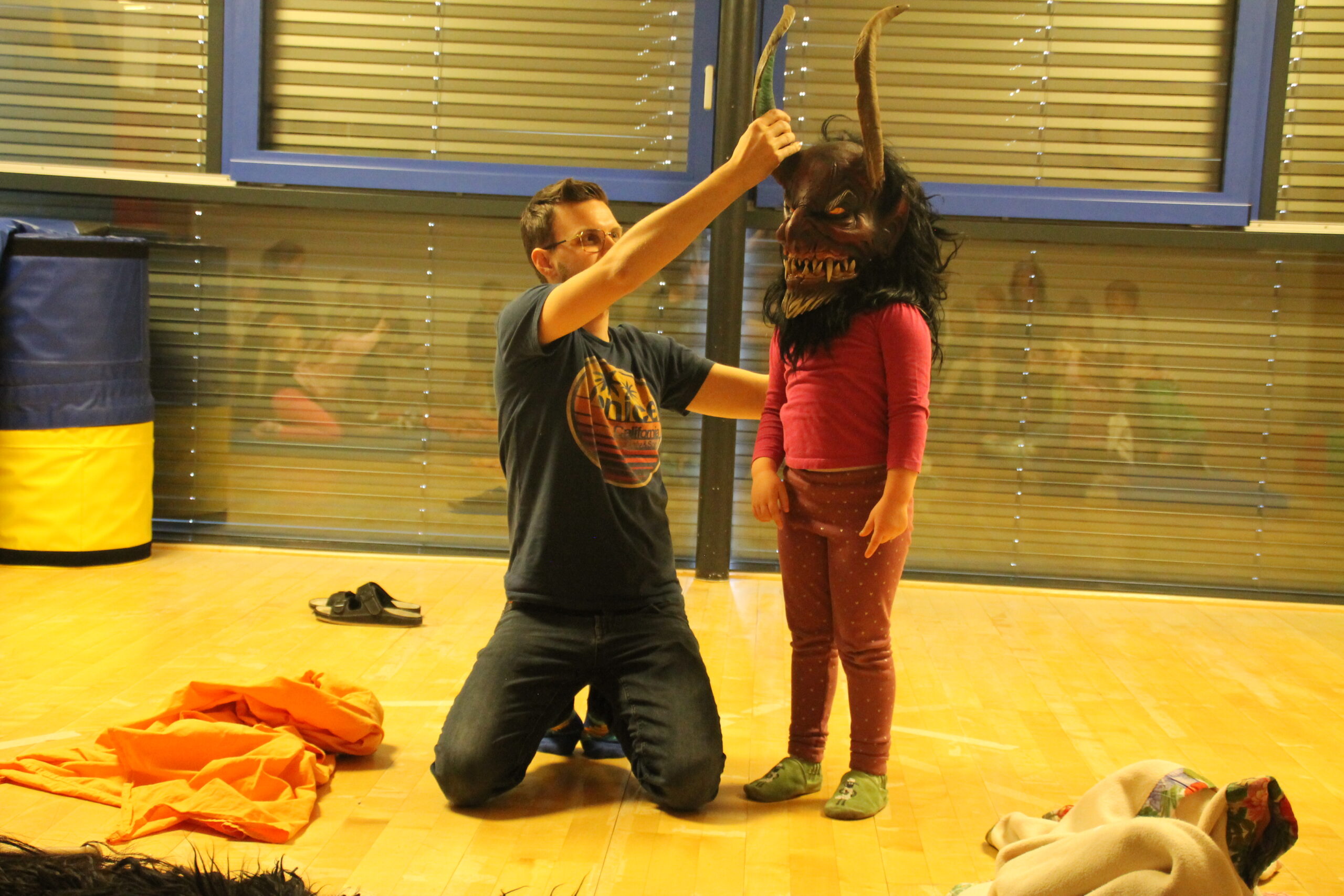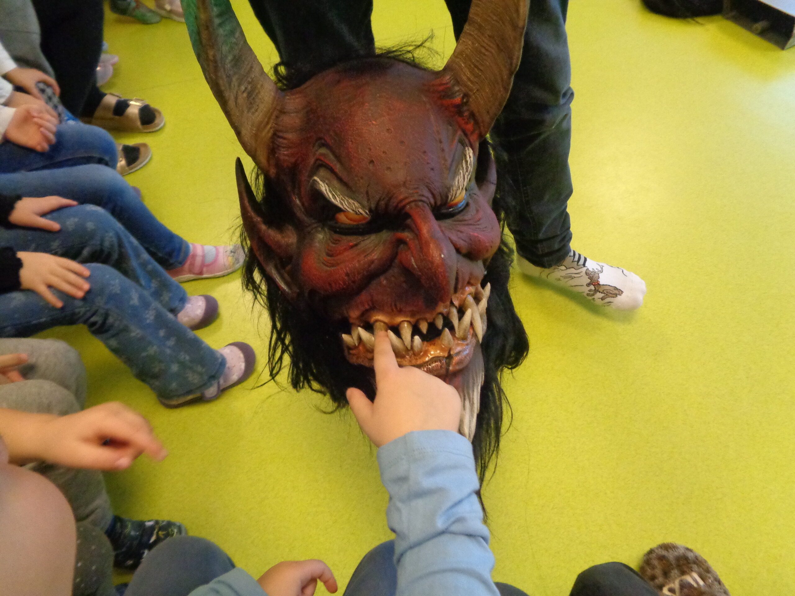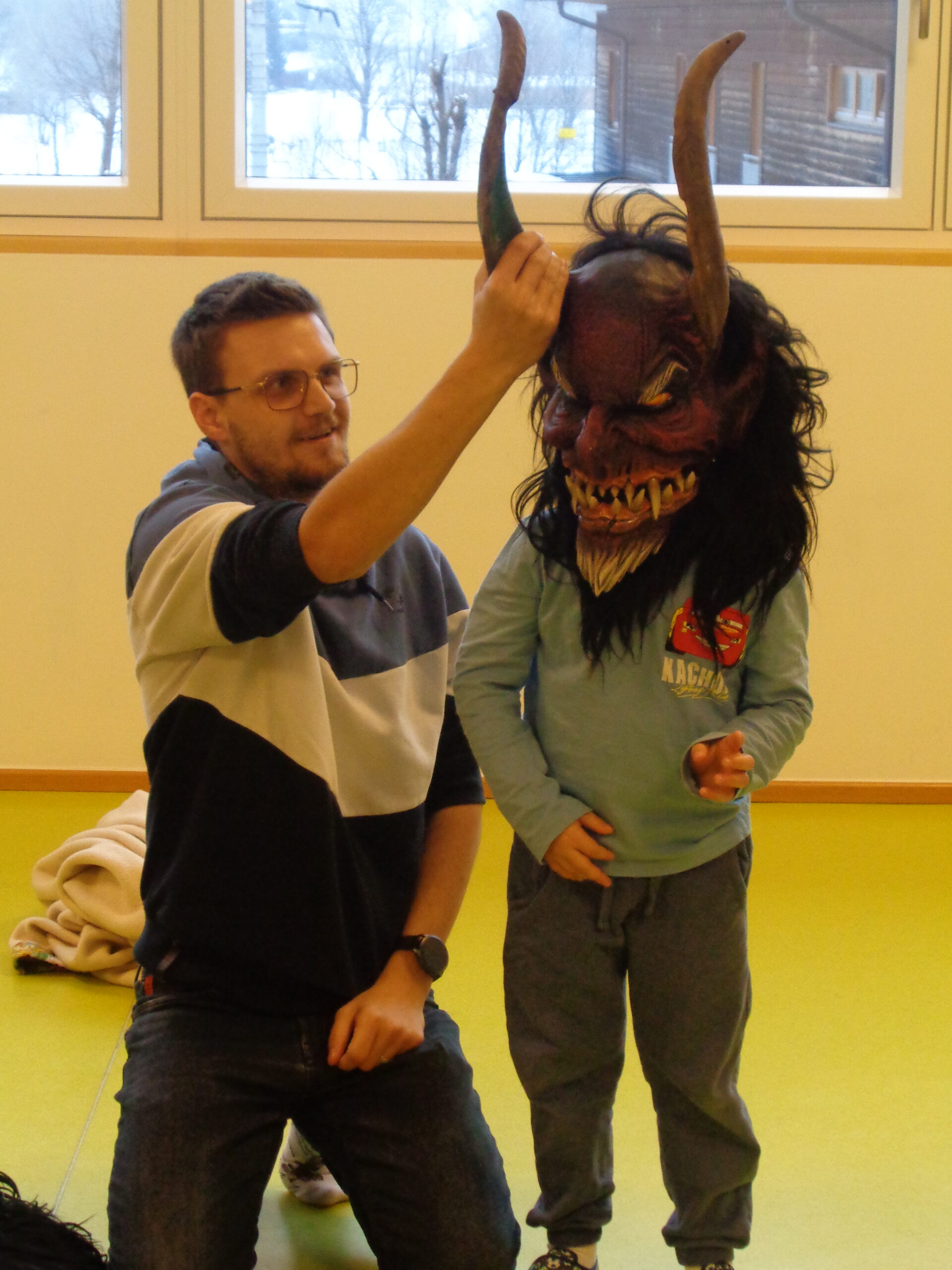 Um ihnen die Angst zu nehmen, wurden verschiedene Krampusutensilien vorgestellt und in einem geschützten Rahmen ausprobiert. Die Kinder konnten die Maske, Felle, Glocken und auch die Rute aus nächster Nähe ansehen, anfassen und damit experimentieren. Dabei wurde kindgerecht erklärt, dass der Krampus ein kultureller Bestandteil unserer Region ist und dass hinter jeder Maske ein ganz normaler Mensch steckt.
