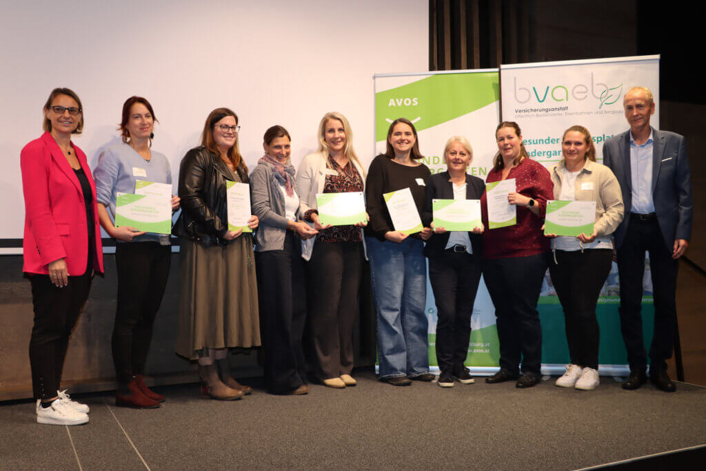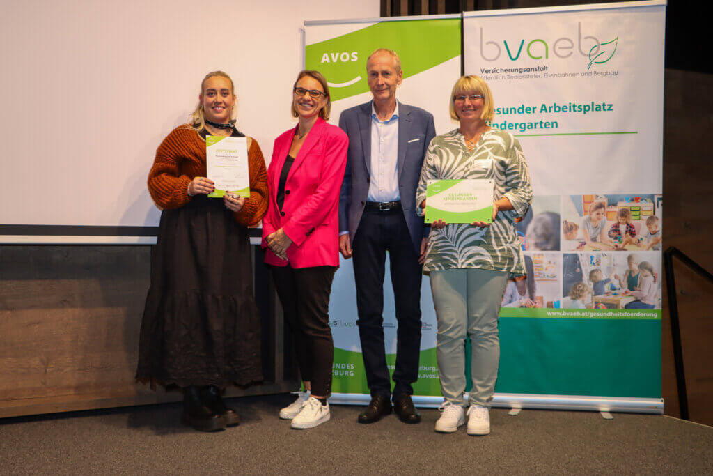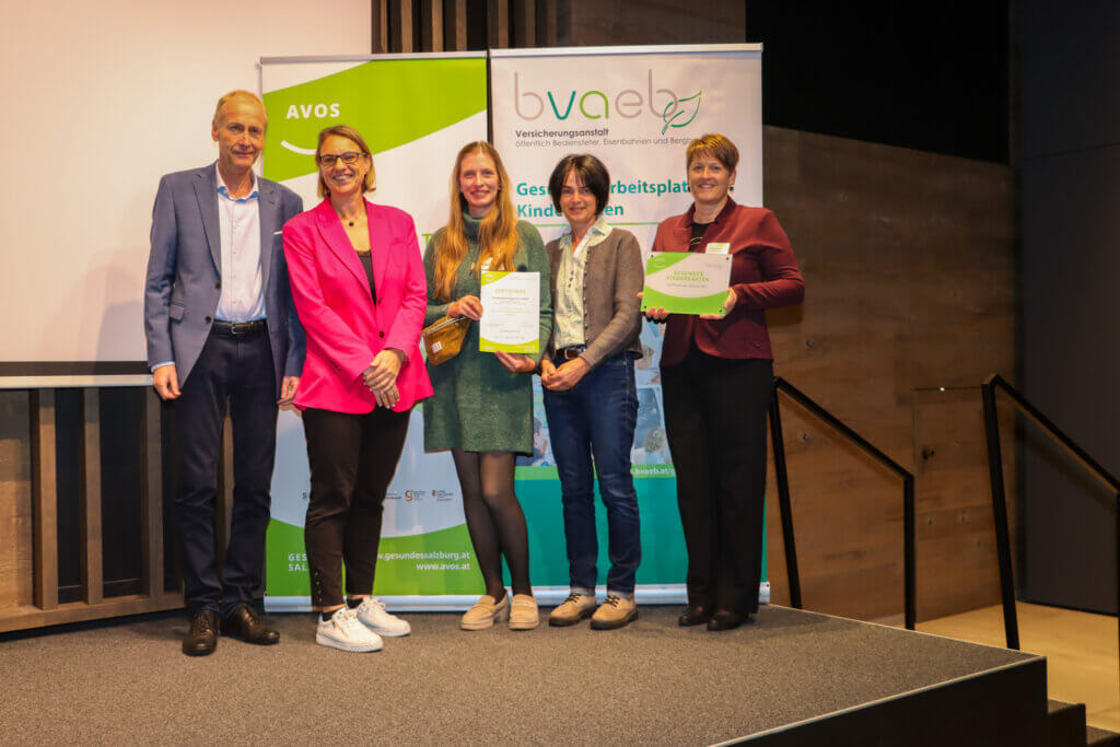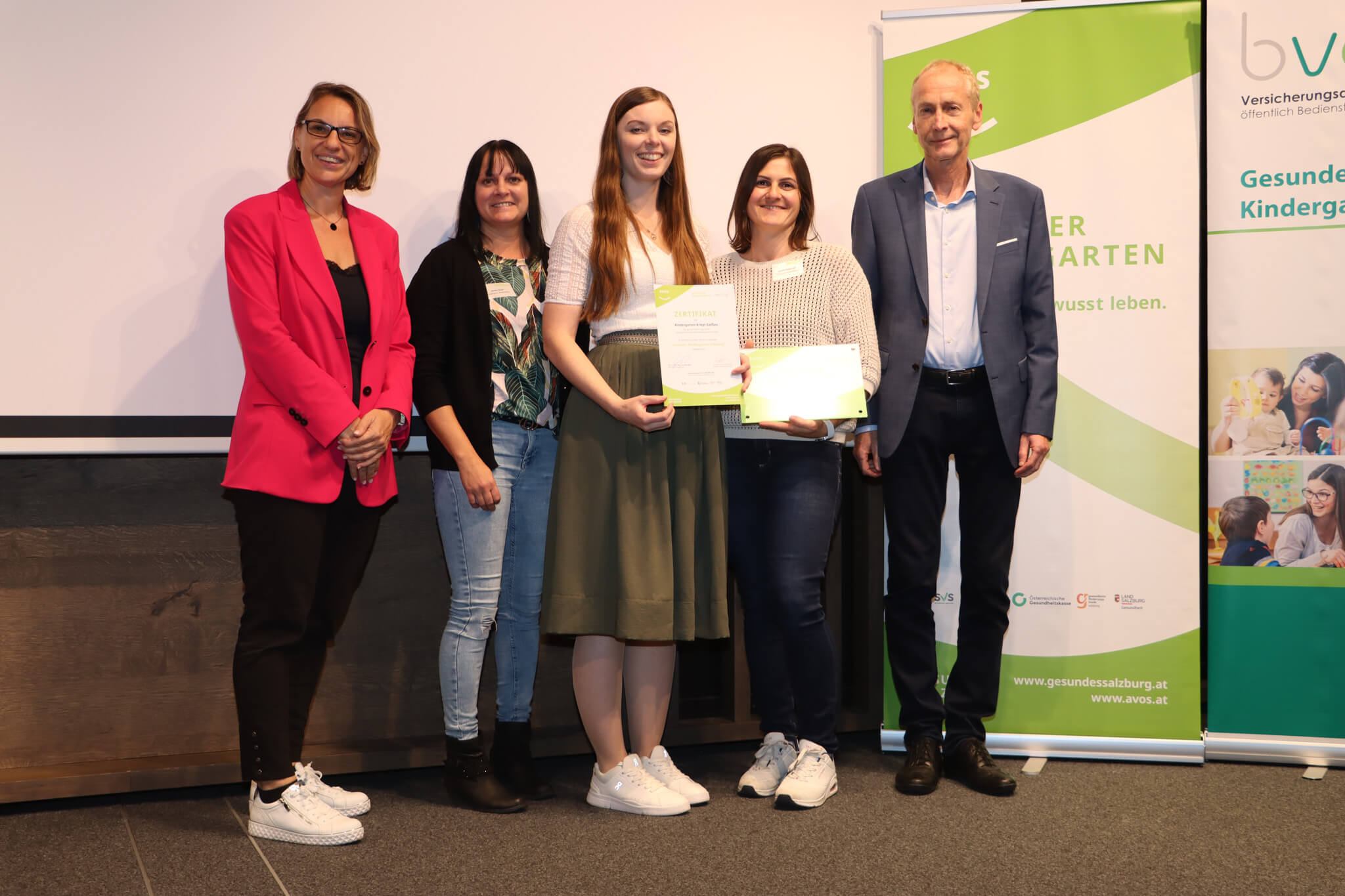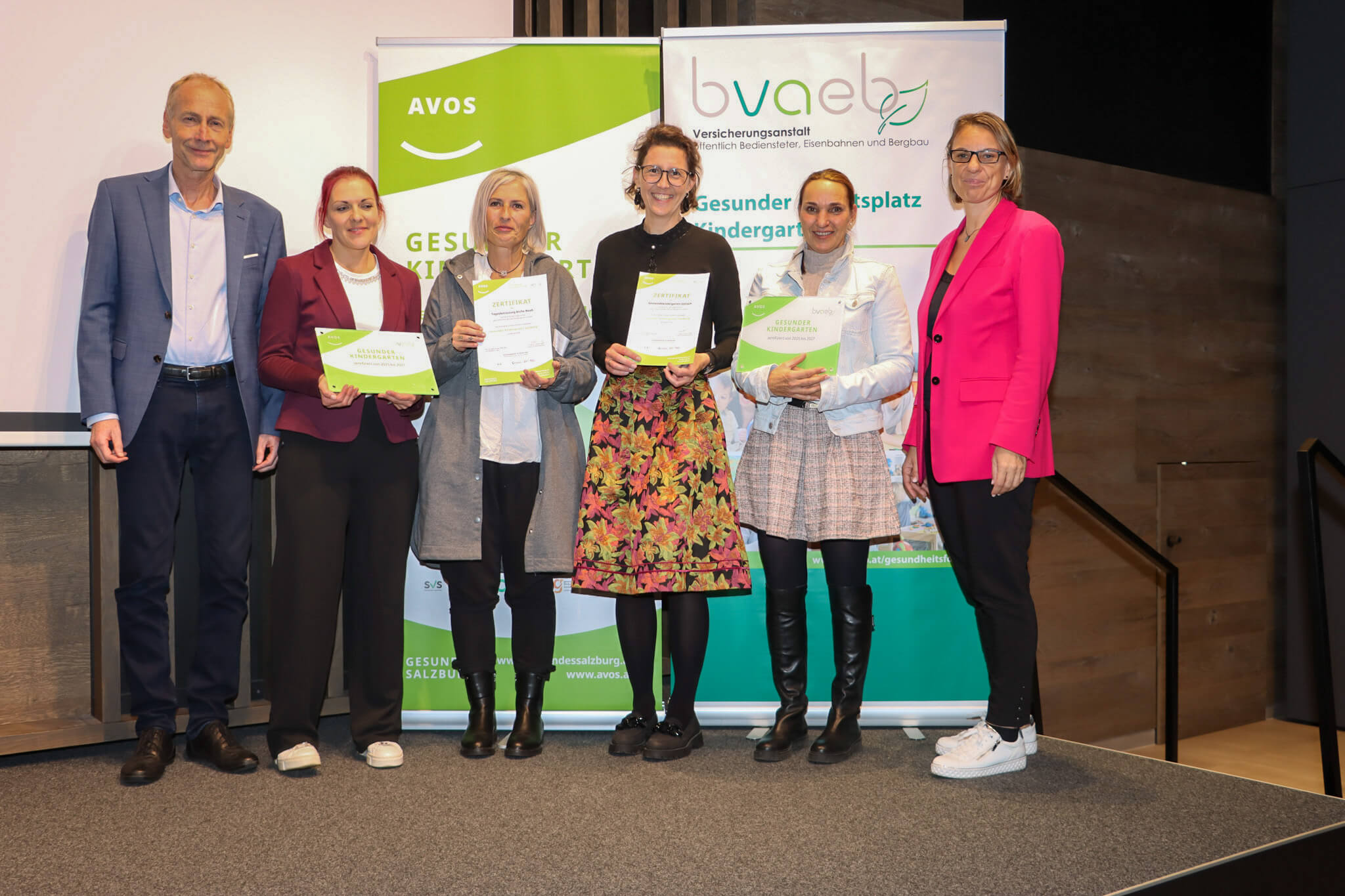 Im feierlichen Rahmen wurden im Anschluss 36 Bildungseinrichtungen aus Stadt und Land Salzburg mit dem Zertifikat „Gesunder Kindergarten“ ausgezeichnet. Während sechs Kindergärten (Kinderbildungs- und -betreuungseinrichtung Kendlerstraße, Pfarrkindergarten St. Vitalis, Kindergarten Aigen, KinderVilla Derra de Moroda, Gemeindekindergarten Großarl, Kindergarten Oberweißburg) erstmals zertifiziert wurden, erhielten 30 weitere Kindergärten eine Rezertifizierung. Die Zertifikate wurden von den Ehrengästen überreicht: AVOS-Präsident MR Dr. Holger Förster, AVOS-Geschäftsführerin Mag.a Angelika Bukovski, MIM, MBA und BVAEB-Direktor Dr. Vinzenz Huber.
