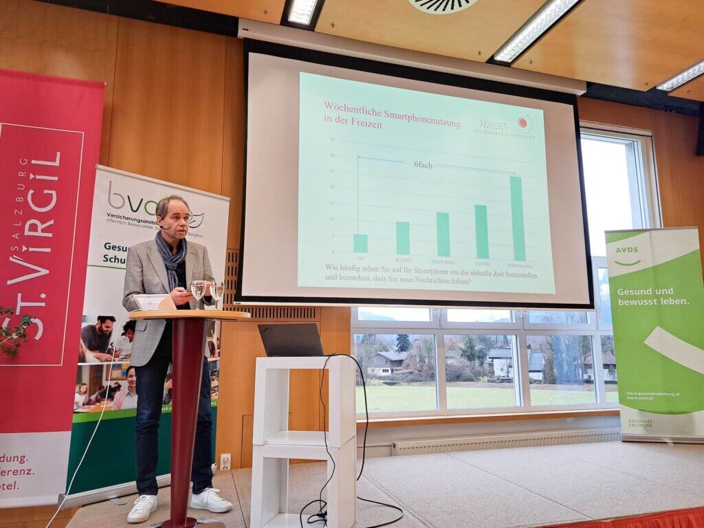 Im Anschluss beleuchtete Priv.-Doz. Mag. Dr. Oliver Scheibenbogen in seiner Keynote „Macht das Smartphone die Schule kaputt?“ die Wirkungen und Nebenwirkungen exzessiver Smartphone-Nutzung. Er erinnerte daran, dass gesellschaftliche Debatten über neue Medien historisch nichts Neues sind – und dennoch besondere Vorsicht geboten ist, da Jugendliche aufgrund ihrer Entwicklung besonders vulnerabel sind. Aufgrund der vielen Funktionen des Smartphones ist sowohl die Diagnostik als auch die Therapie exzessiven Smartphonegebrauchs äußerst schwierig. Scheibenbogen zeigte Maßnahmen auf, die einen risikoarmen Umgang fördern können.