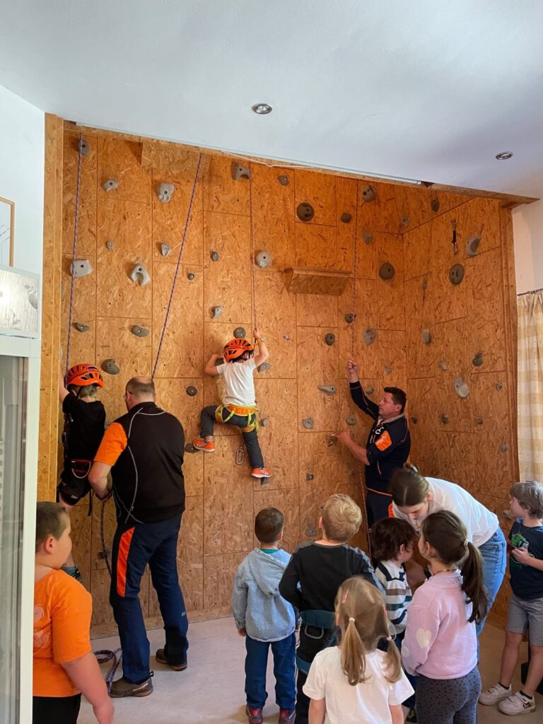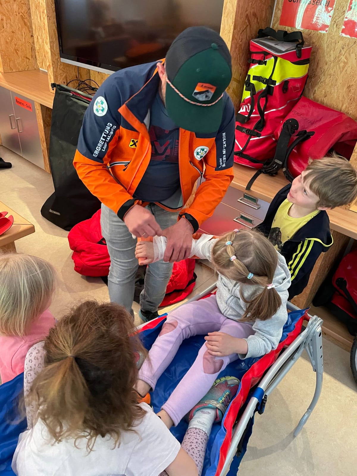 Anschließend besichtigten wir den Aufenthaltsraum der Bergrettung. Dort befindet sich auch eine Kletterwand, die sofort großes Interesse weckte. In einem spielerischen Rollenspiel wurden die Kinder „ärztlich“ versorgt. Sie durften die Akja-Liege kennenlernen und erfuhren, wie Verbände angelegt werden. So konnten Ängste abgebaut und erste Erfahrungen mit Rettungssituationen gesammelt werden.