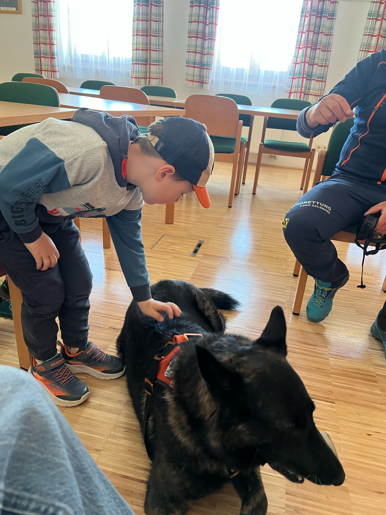 Besonders spannend war die kurze Schulung mit dem Lawinenhund Sky. Die Kinder lernten, welche Aufgaben ein Lawinenhund hat und konnten beobachten, wie konzentriert und gut trainiert Sky arbeitet.