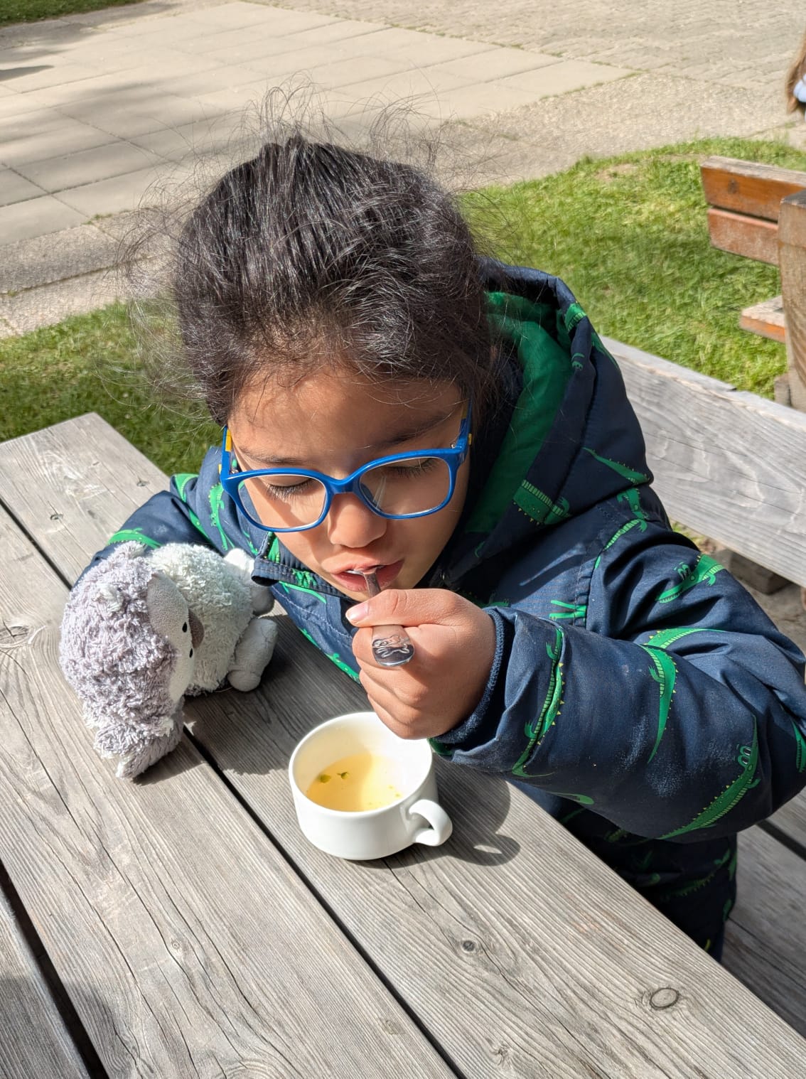 Nach erfolgreicher Jagd wurde gemeinsam gewaschen und gekocht. Am Ende gab es eine Gänseblümchensuppe frisch aus dem eigenen Garten, die nicht nur schmeckte, sondern auch zeigte, wie köstlich und spannend Natur sein kann.
