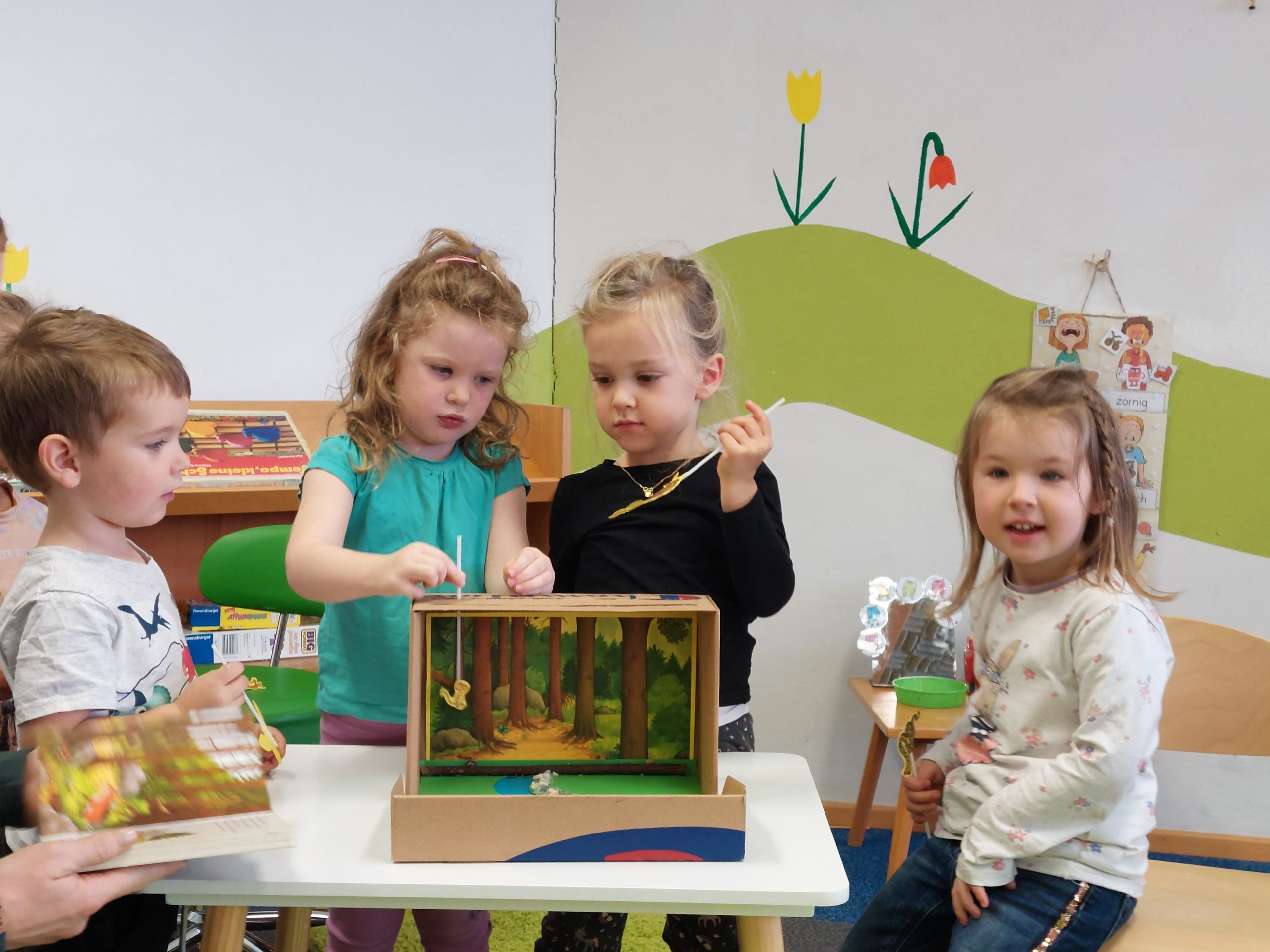 Regelmäßig genießen die Kinder eine Vorstellung mit dem Kamishibai. Und schlüpfen danach selber in die Rolle des Erzählers.