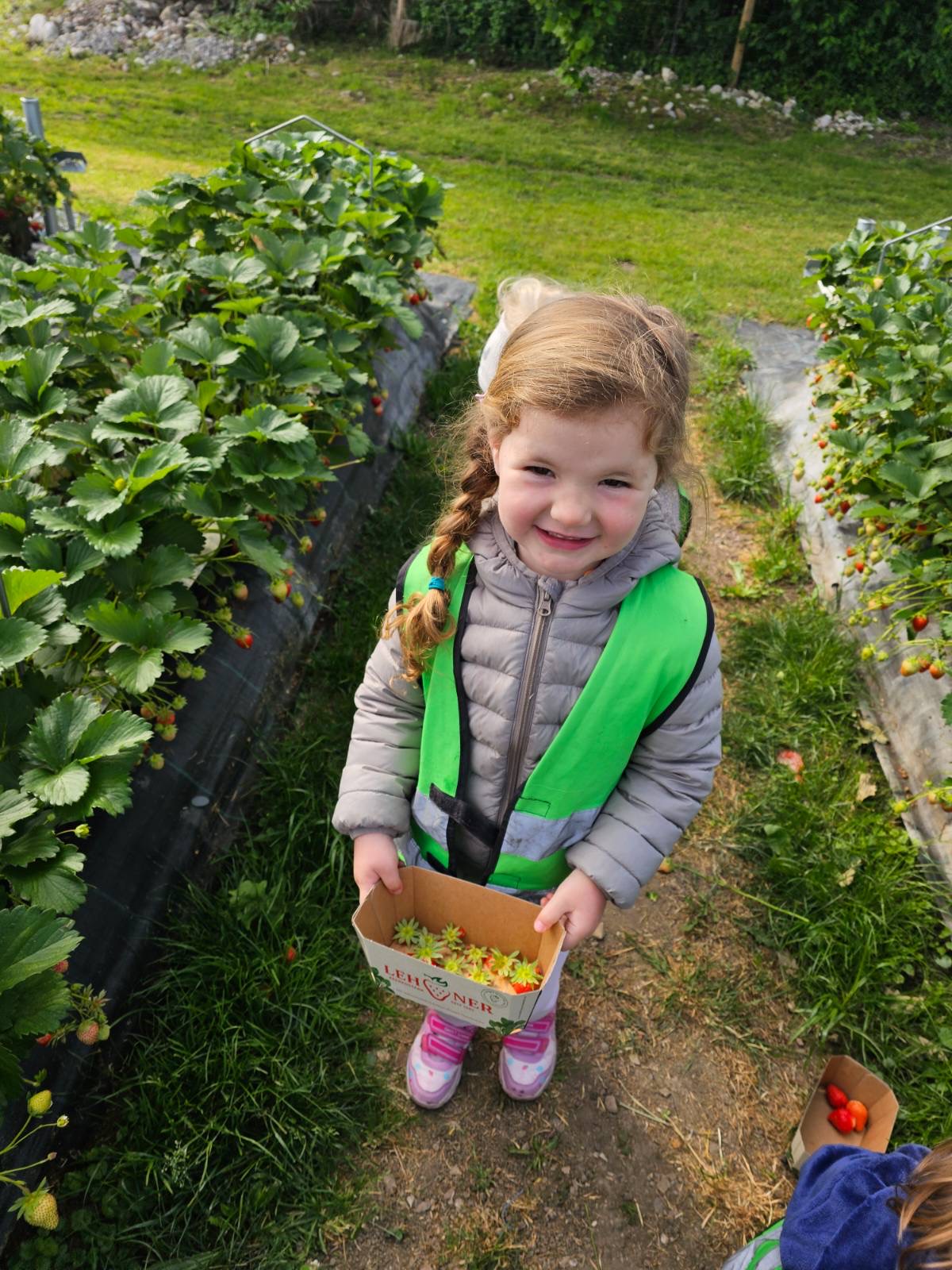 Da eine gesunde Jause bei uns selbstverständlich ist, führte der letzte Ausflug ins Erdbeerland. Dort pflückten die Kinder frische Erdbeeren und bereiteten daraus gemeinsam ein leckeres Erdbeereis zu.