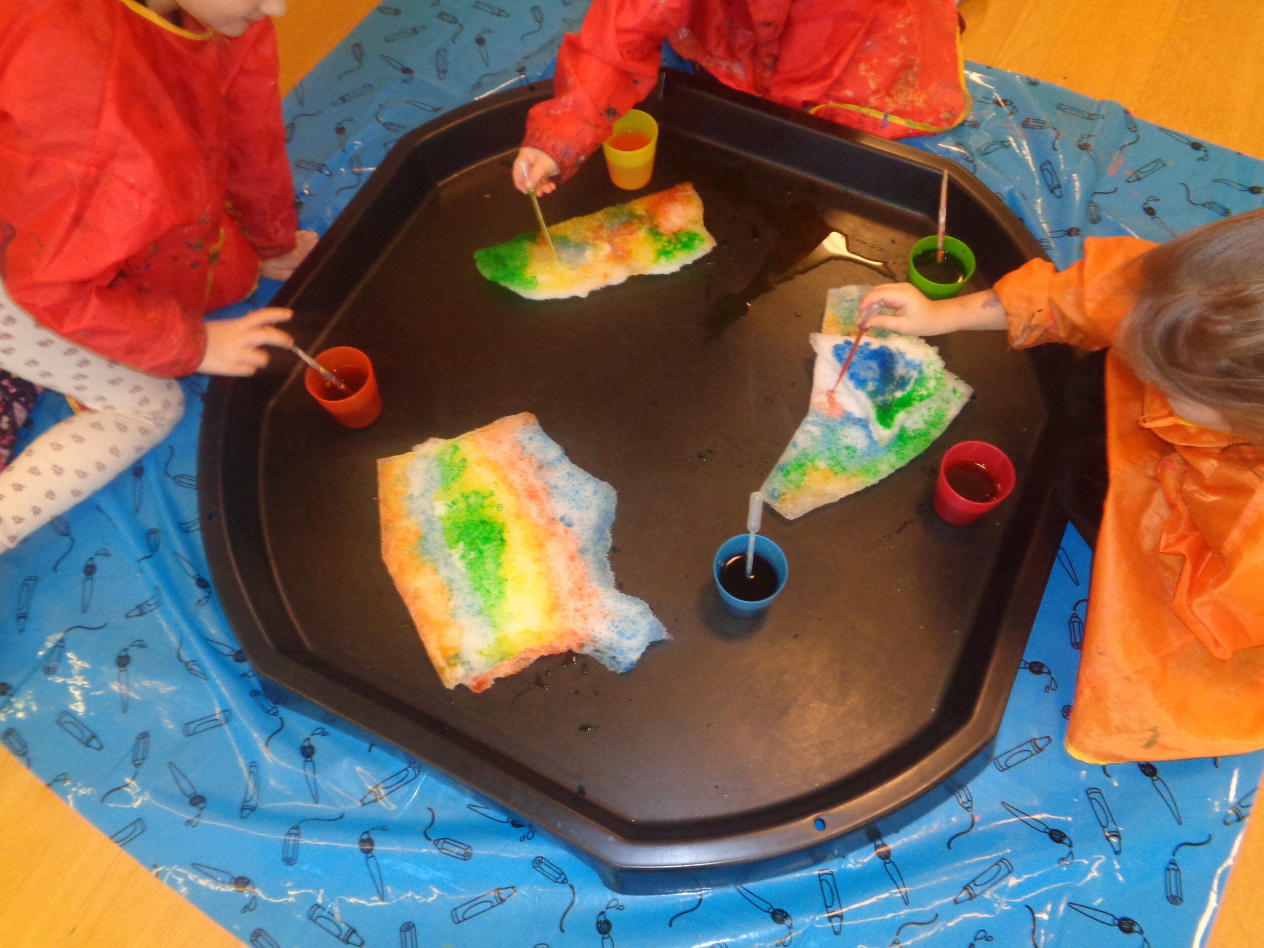 Im Anschluss wurde es kreativ: Wir testeten, ob sich Schnee mit gefärbtem Wasser bemalen lässt. Dabei entstanden beeindruckende Kunstwerke. Auch umgekehrt funktionierte es wunderbar: Mit gefärbten Eiswürfeln konnten die Kinder nicht nur unterschiedliche Aggregatzustände hautnah erleben, sondern ihrer Kreativität freien Lauf lassen.